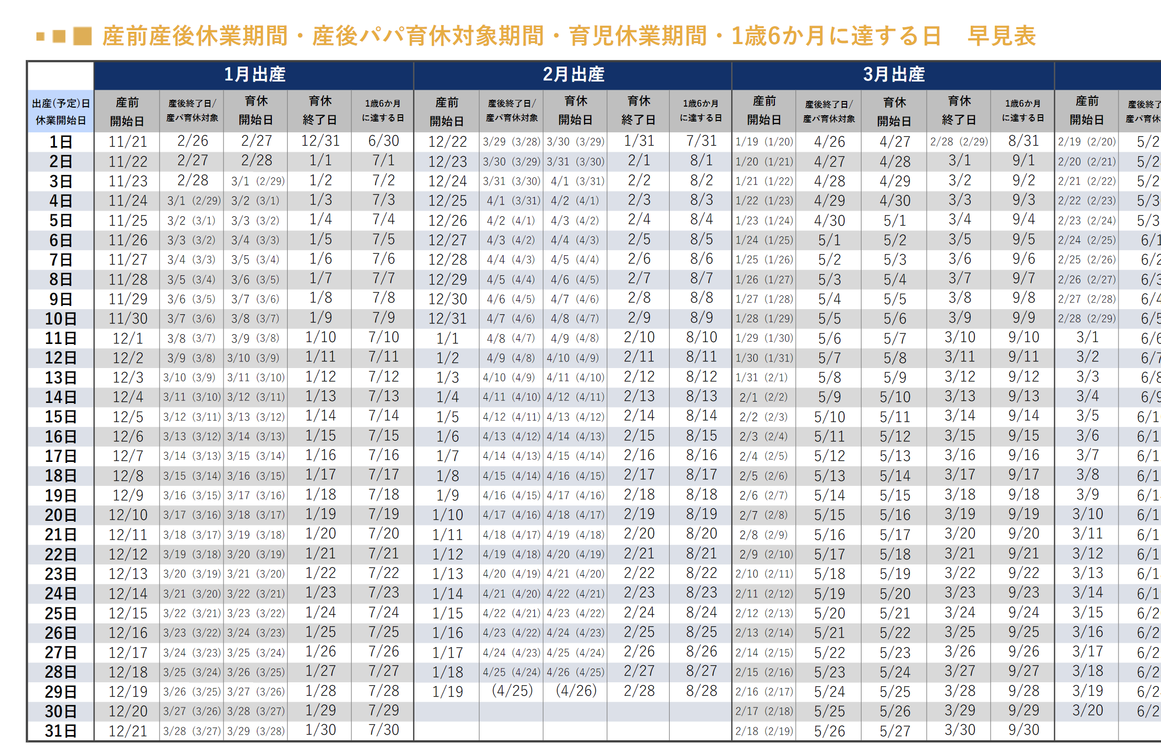 資料タイトルの通り、産育休に関する各日を一目でチェックできる早見表です。