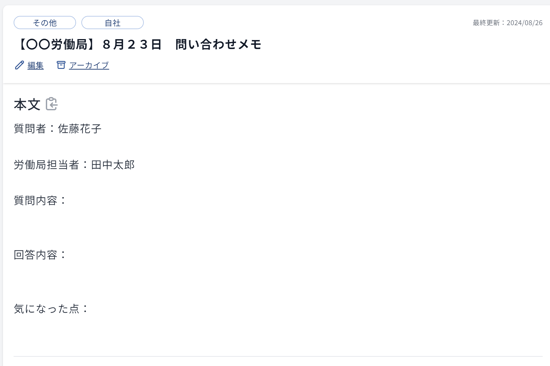 労働局などの担当者から回答された内容を記載します。その際、できるだけ「回答された言葉のまま」で残すことがお勧めです。「こういう意味合いで言ったのだろう」という推測が入った記載をしていまうと、ちょっとしたズレが大きな誤解を生んでしまうことにもなります。特に、質問の前後関係が分からないままで言葉を鵜吞みにしてしまうと「言った/言ってない」といった押し問答になりやすいので、担当者が話した言葉をそのまま残す方が良いですね。