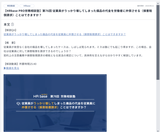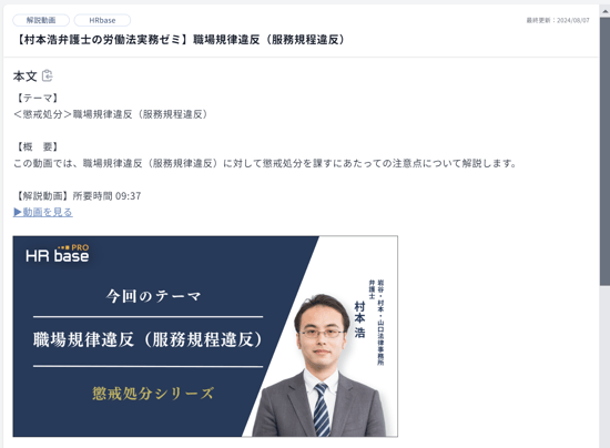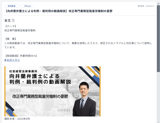 資料一覧にある「解説動画」では、HRbaseと連携している弁護士先生からの「法的解釈に関する解説」や、