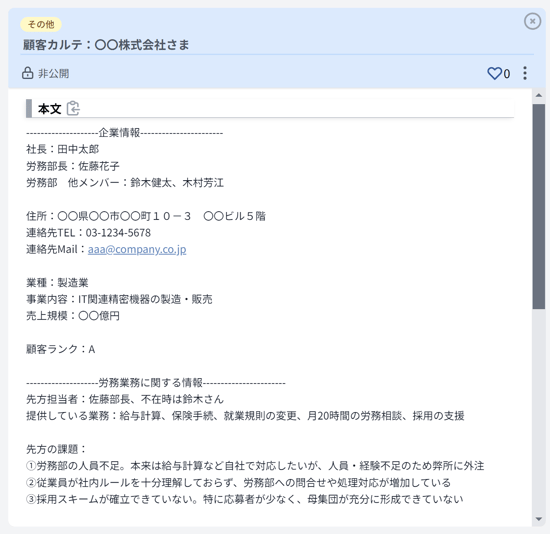 顧客カルテとは、簡単に言うと「顧客(顧問先)の情報整理」です。顧問先が少ないうちは各社の情報を覚えておくこともできますが、顧問先が20件・30件と増えてくると「あの顧問先の労務担当者は、どんな方だったかな?」となってしまうこともあります。