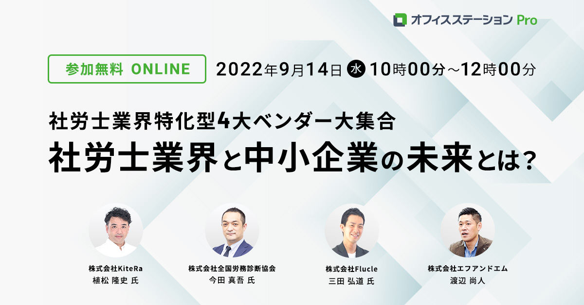 そこで今回は、社労士業界に特化したテクノロジーを提供している注目の3ベンダーにお集りいただき、弊社含む4ベンダーで「今後の社労士業界、そして中小企業の未来について語りつくす120分」として、イベントを企画する運びとなりました。