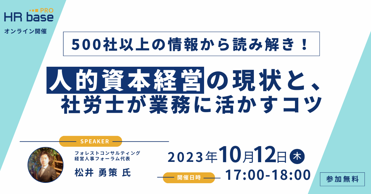 本セミナーでは、中小企業や成長中の企業・IPO等を目指す企業で適用必須の「人的資本経営の最新状況と事例」についてお伝えします。また、その上で「顧客への対応や行動を変えていく必要性」について解説し、今後の社労士に必要な提案技術・注目すべき分野などについて詳細をお伝えします。