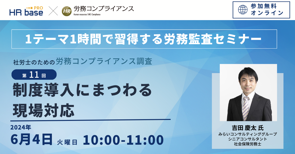 本セミナーでは、金融機関向けの勉強会・セミナー登壇で受けた質問や相談への回答を参考に、実務に役立つ労務コンプライアンス調査の対応方法について、みらいコンサルティンググループ吉田氏よりお話していただきます。