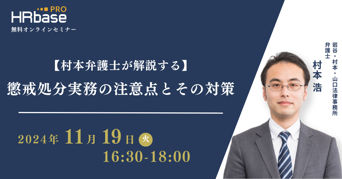 本セミナーでは、岩谷・村本・山口法律事務所の村本浩弁護士より、法的観点と実務的アプローチの両面から、懲戒処分の押さえるべきポイントを徹底解説していただきます。証拠の収集方法、本人へのヒアリングの進め方、弁明の機会の付与など、現場で役立つ具体的なノウハウもご提供します。ぜひご参加ください。