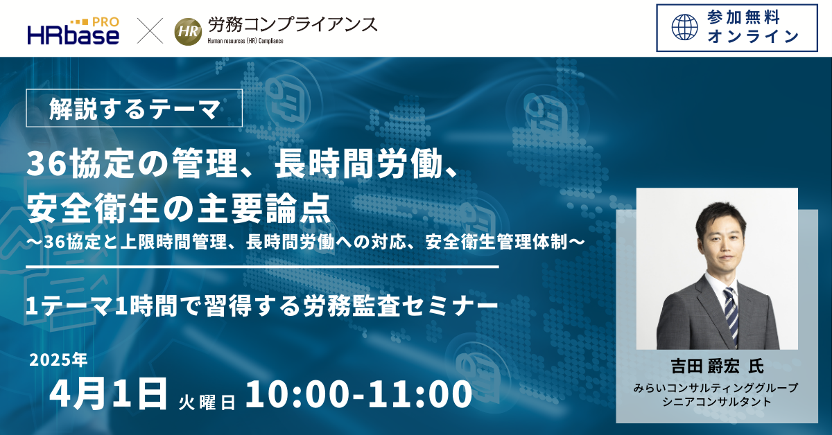 本セミナーでは、金融機関向けの勉強会・セミナー登壇で受けた質問や相談への回答を参考に、実務に役立つ労務コンプライアンス調査の対応方法について、みらいコンサルティンググループ吉田氏よりお話していただきます。