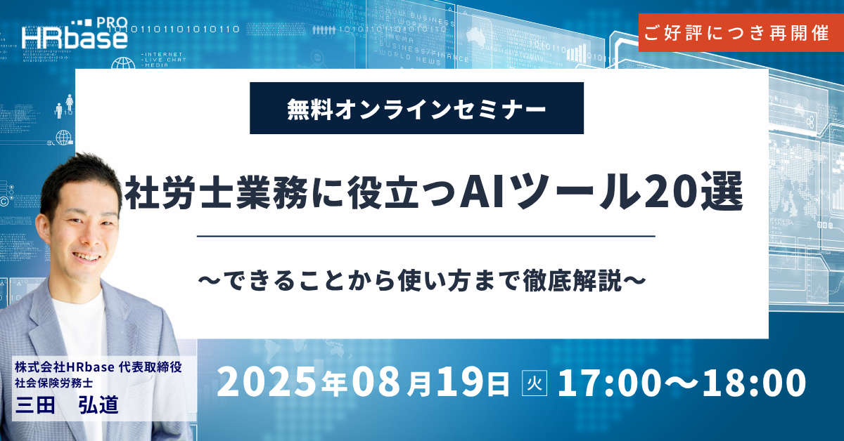 ChatGPTの登場からはや3年、生成AIは日々進化しつづけ、世の中はたくさんのAIツールで溢れるようになりました。しかし、社労士業界では、毎日業務で使いこなしている先生と、たまに使う程度、あるいはまったく活用できていない先生で、二極化しているのか現状ではないでしょうか。 本セミナーでは、社労士向けAIツールの開発者である三田より、最新のAI動向やおすすめのAIツール情報を詳しくご紹介します。 他のセミナーではなかなか聞けない、AIツールの社労士業務に特化した活用方法も徹底解説! 事務所の業務効率化を推進したい先生は、ぜひご参加ください。